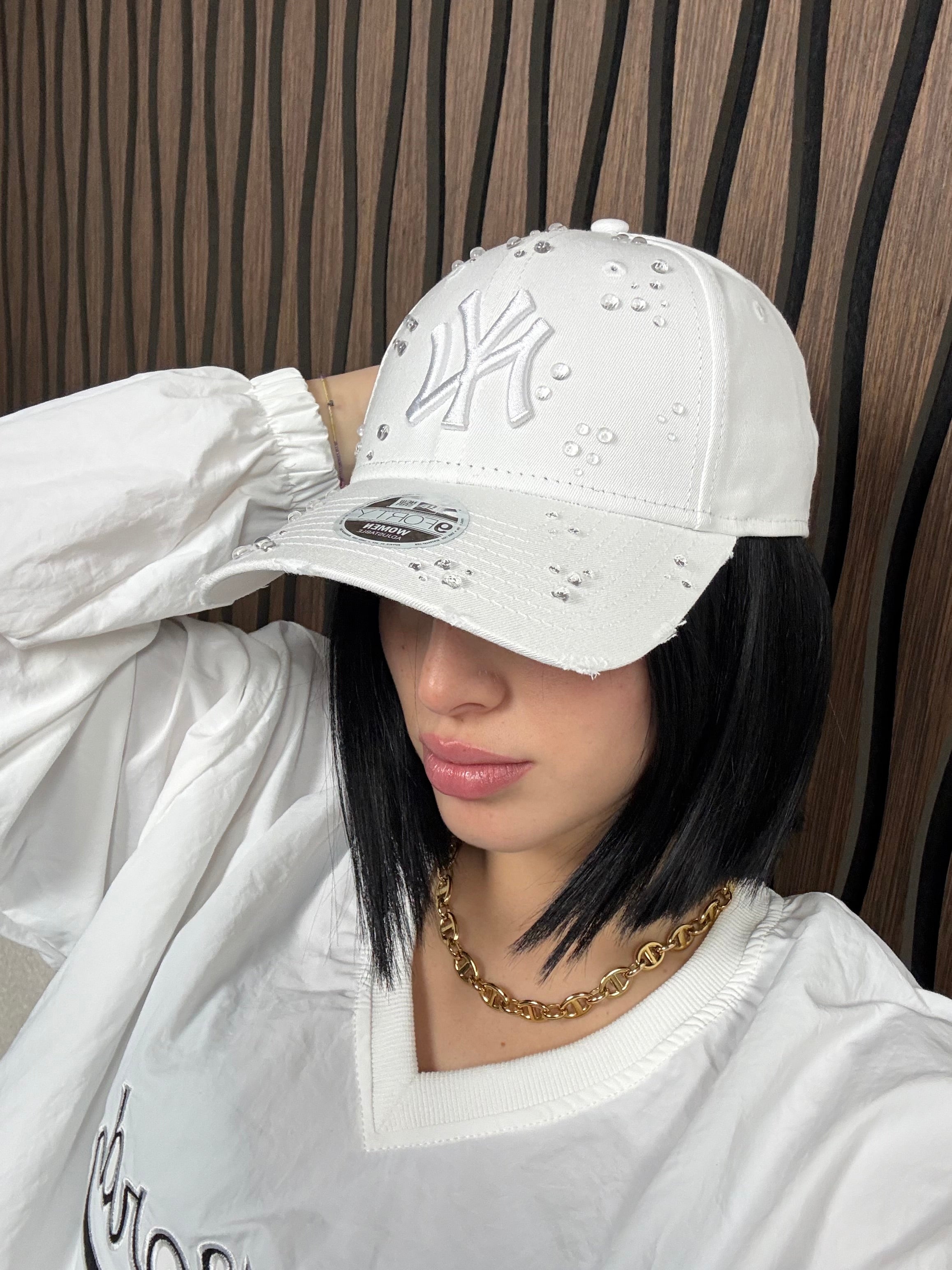 Parte da un autentico cappello New Era di qualità premium e viene completamente personalizzato mediante applicazioni artigianali manuali. Ogni dettaglio è aggiunto a mano, garantendo una qualità superiore e un'attenzione ai dettagli che solo la customizzazione handmade può offrire. Il design include eleganti ciondoli laterali che aggiungono un tocco distintivo e personalizzato al cappello.